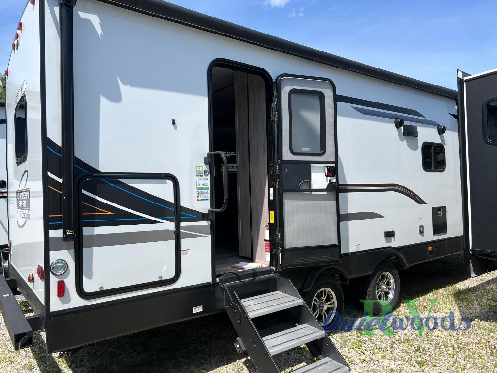 With any Northern Spirit Ultra Lite travel trailer by Coachmen, the "Twice Cool" dual ducted air conditioning system, the motion activated floor lights in the bedroom and bathroom, the lighted USB ports, the digital level, and the motion activated pass-through storage light plus fishing pole storage, will make your camping experience simplified. The heated and enclosed underbelly provides protection on the road and allows you to camp during any season, the 100W solar panel with 10 amp controller provides off-grid camping, and the power tongue jack makes setup easier. Each is built with a painted fiberglass front cap with LED strip lights, a laminated, aluminum framed floor, rear wall, and sidewalls, plus 5" trusses with interior vault. Make your decision today, and camp with everything in its place!