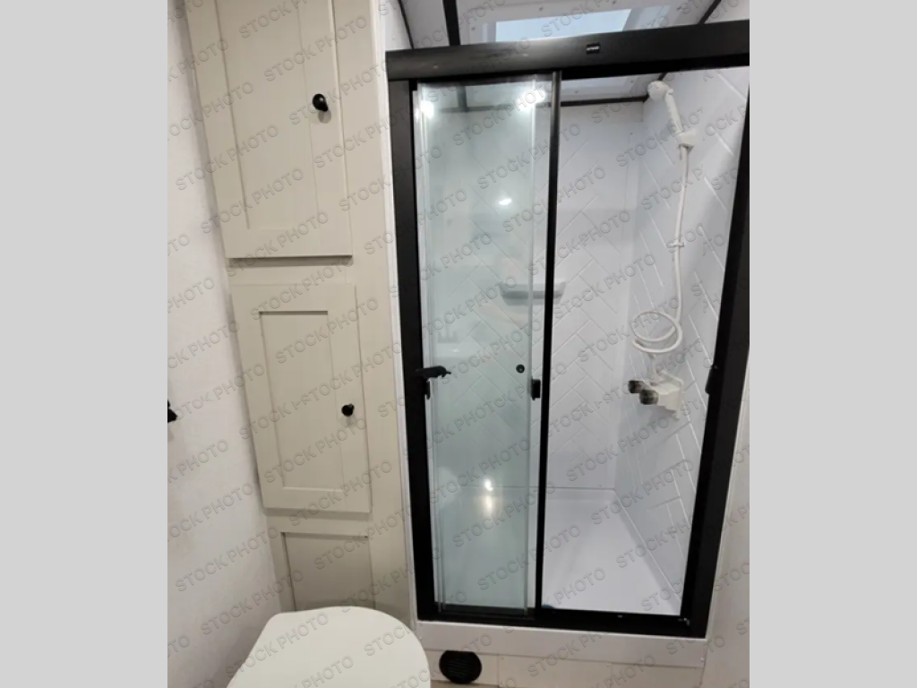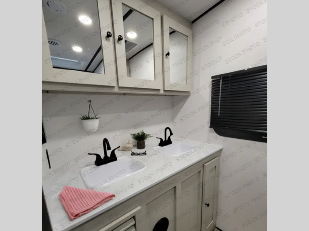 A rear bath with dual sink vanity, a king bed slide with drawers beneath for plenty of storage, and a front kitchen with breakfast bar and pantry as you enter all make this a great unit. You will enjoy plenty of space with a large slide in the bedroom and combined living area and kitchen. Theater seats are perfect for winding down your day inside, and a slide out king bed is a great way to enjoy a great night's rest. There is even washer and dryer prep in the bedroom if you choose to add those appliances! In the very rear of the unit, a spacious bath with large shower, a linen cabinet and dual sink vanity so both can get ready at once. In the front kitchen you will find all the amenities to enjoy creating meals and snacks as you travel. There are two pantries with one just inside the door to your left, and one along the front wall near the refrigerator and theater seating slide.