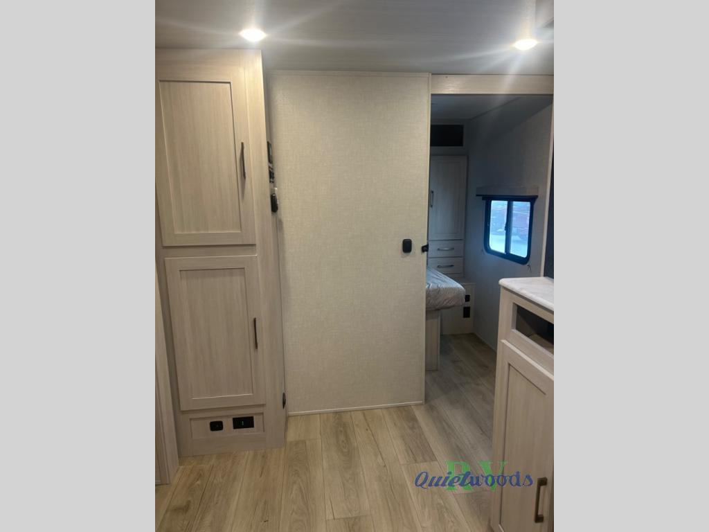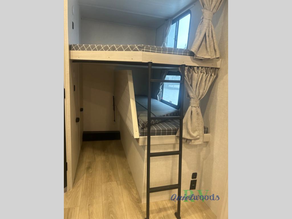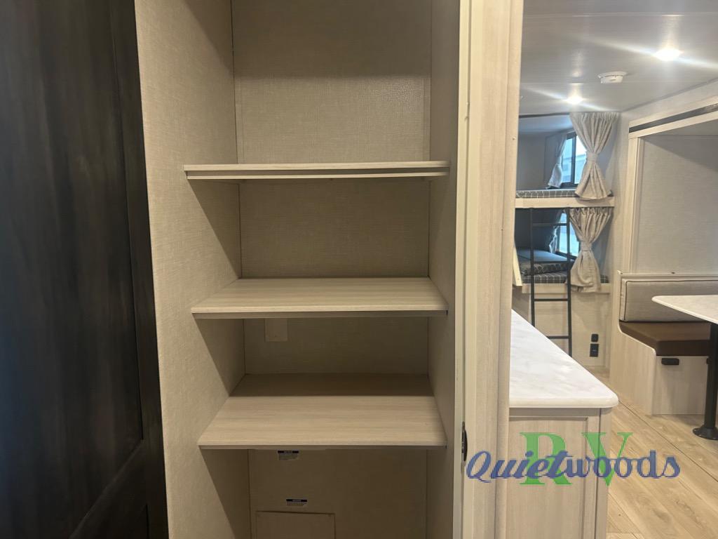 Head to your favorite camping spot with your favorite people in this spacious, dual entry travel trailer! The large slide out houses the U-shaped dinette and sofa where you can relax in the evenings and even let guests sleep over who haven't claimed the double-size bunks. A full bath with its own exterior entry door is convenient for all, and the full kitchen lets you whip up your best meals in the microwave with an air fryer. There is also a walk-in pantry with washer and dryer prep, which gives you the option to add those appliances. When it's time to call it a night, the front private bedroom with a queen bed will provide you with your own space to retreat to, and there are dual bedside wardrobes to keep your clothes organized.