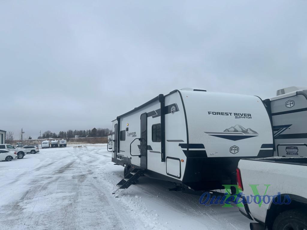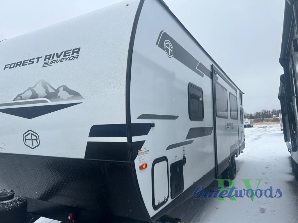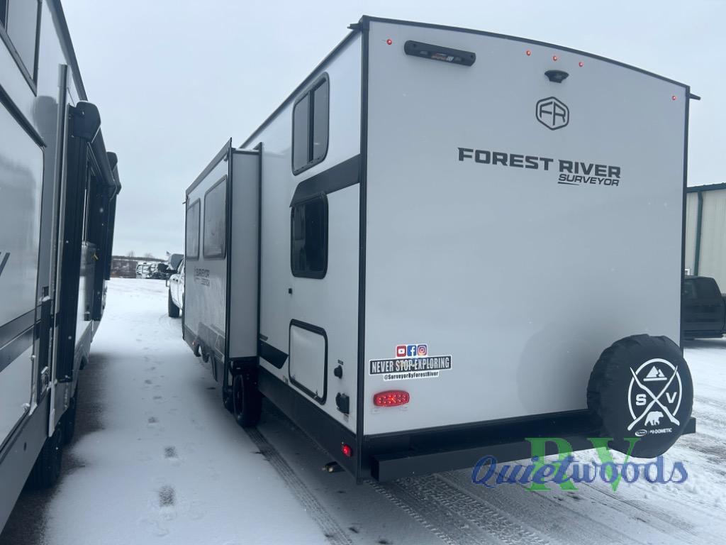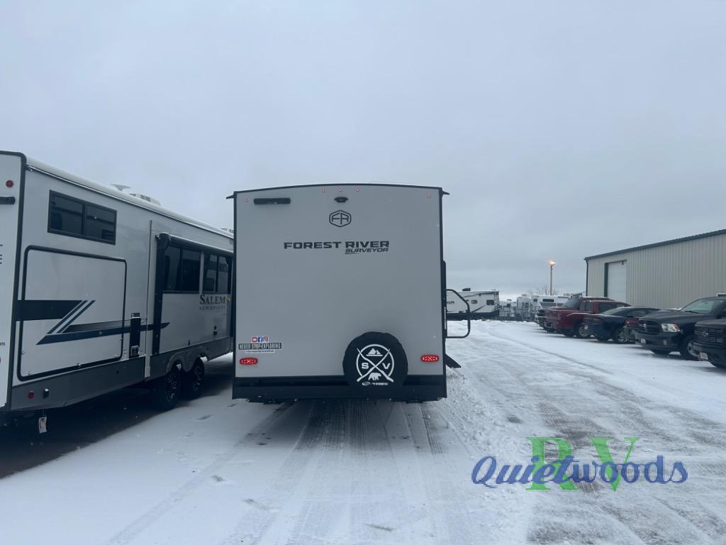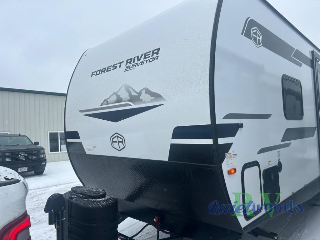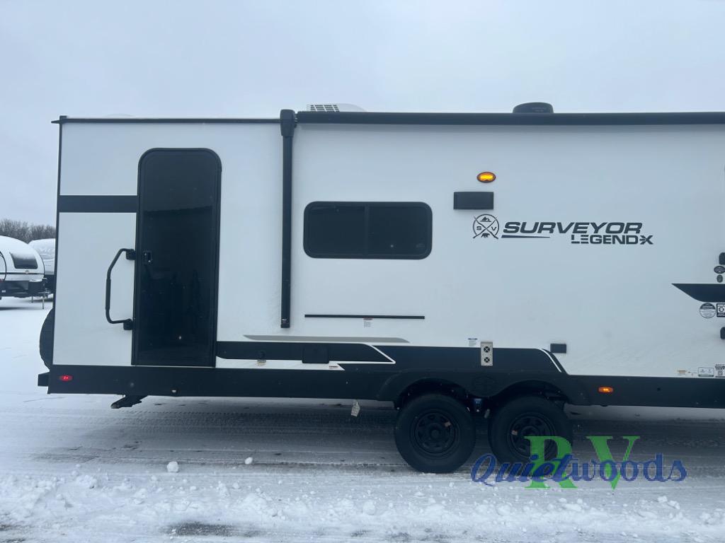 Value and versatility go hand-in-hand with the Surveyor Legend X travel trailers by Forest River. The solid construction includes a 2" aluminum framed floor with block foam insulation and a sealed underbelly with forced heat and radiant foil insulation. A 100-watt roof mounted solar panel will provide some off-grid power, and the power tongue jack will let you easily hitch up and go whenever you're ready. Additional stand-out features include Surf(X) seamless countertops throughout, two A/C units, an electric awning with LED light strip, black glass friction hinge entry door(s), and so much more!