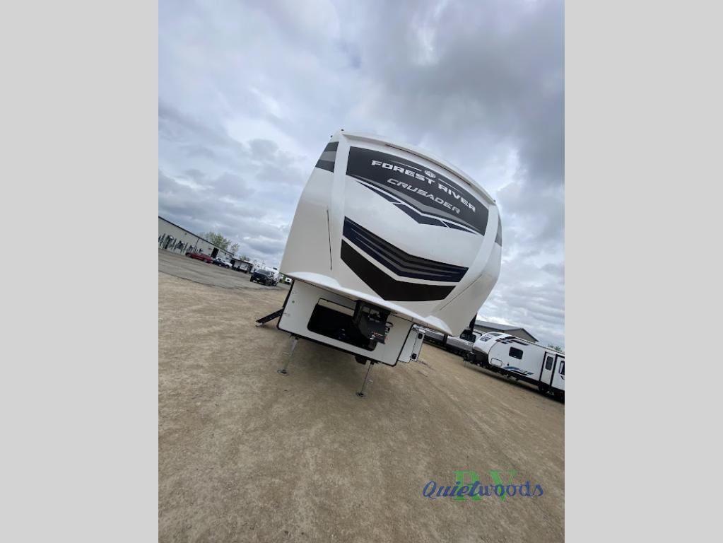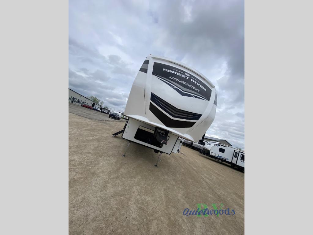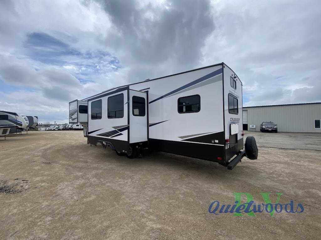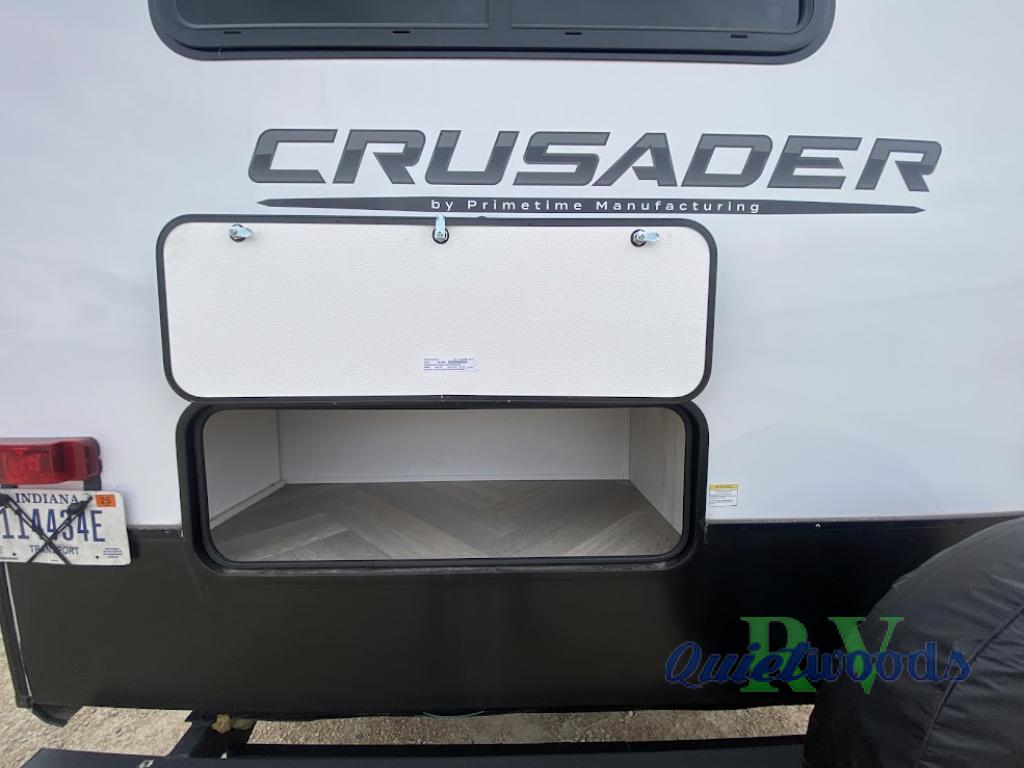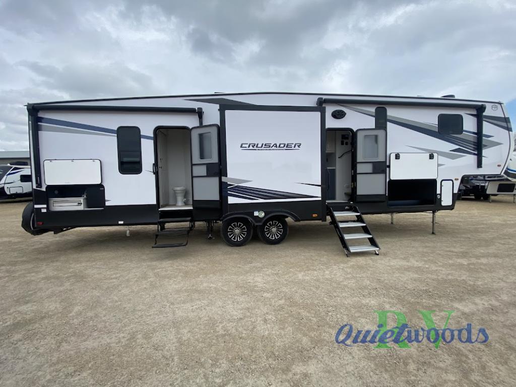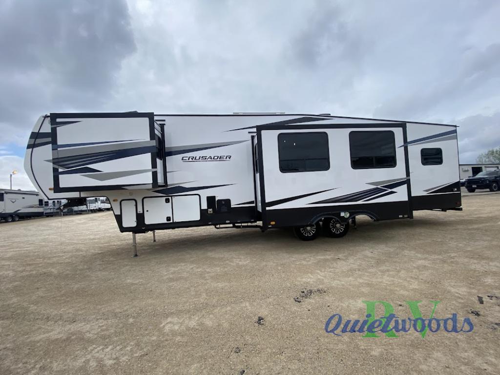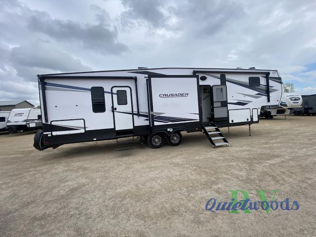 The Crusader fifth wheels by Prime Time RV are a step above the rest and it's not hard to see why. Each model has been constructed to last with its Eternabond construction, a one-piece PVC roof, and high gloss gel coat fiberglass exterior. The auto leveling system and the comprehensive universal docking center will have you set up to camp in no-time, and there is a convenient bottle opener and Doggy D-ring for your furry companions. You will fall in love with the interior that includes heat rated solid surface countertops, designer Carefree linoleum with Scotchgard technology, hardwood cabinet doors, and many more residential comforts. The Crusader also comes standard with dual 15,000 BTU A/C units, a 35,000 BTU high capacity gas furnace, a tankless on-demand water heater, and the Extreme Thermal Package Plus, making your camping season year-around!
