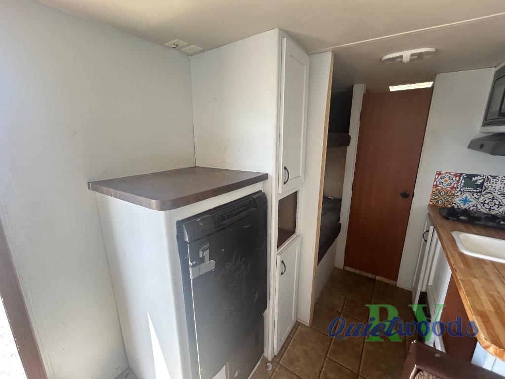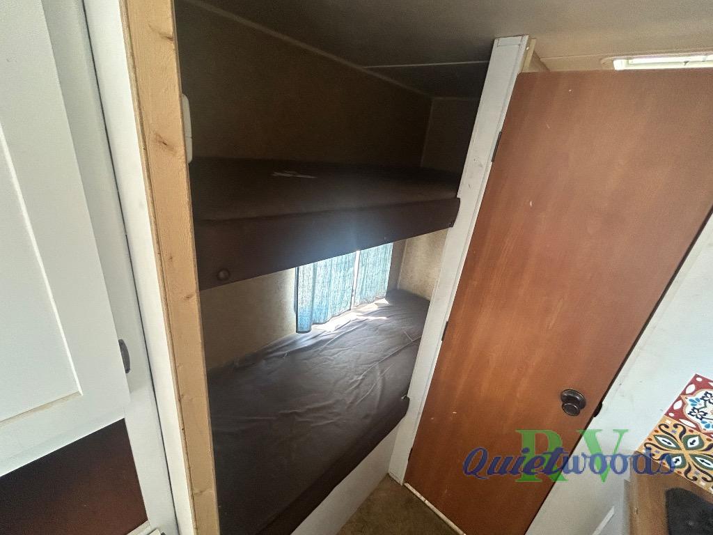 Two bunk beds are located in the rear left of the travel trailer. A bathroom including a toilet and tub/shower combination is in the right rear. Continuing around you will find a two burner range, single galley sink, countertops and overhead cabinets. A pantry and a refrigerator/entertainment center are housed on the opposite wall.