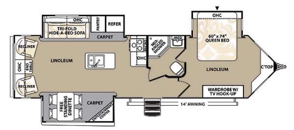 As you enter the travel trailer, to the left there is a slide with a corner entertainment center and a free-standing dinette. Along the rear wall there are two recliners and an end table. The other slide offers a tri-fold hide-a-bed sofa, pantry, and refrigerator. Next to the slide there is a three burner range, and microwave. You will even find a kitchen island which has extra counter space and a double kitchen sink.