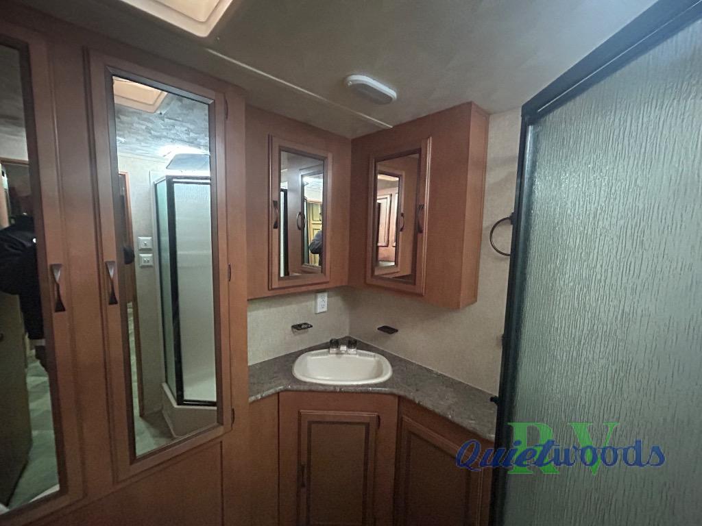 Outside, you may choose an optional outdoor kitchen with a bumper mount grill, overhead microwave, overhead cabinet, sink and refrigerator. You can even choose an optional exterior grill. An exterior TV bracket is standard on this model.