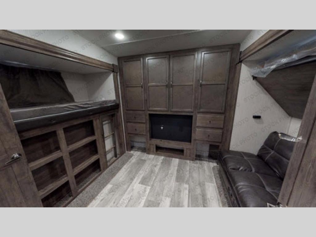 Take the family on the trip of a lifetime with this Sandpiper fifth wheel! From its private bunkhouse suite in the back to its private master bedroom in the front, you will have plenty of space to bring along family and friends as you tour historic sites all across the country. The two entry doors give you convenient access into this unit so that you can load up your luggage and camping gear quite easily, and the kitchen island will come in handy as you prepare dinner each evening. Your crew can get comfortable on the hide-a-bed sofa, the booth dinette, or the theater seating, and the ceiling fan will give a cool breeze after being outdoors all day. This model also includes an exterior kitchen, complete with a sink, refrigerator, and a bumper mount swivel gas grill to cook up your best BBQ!