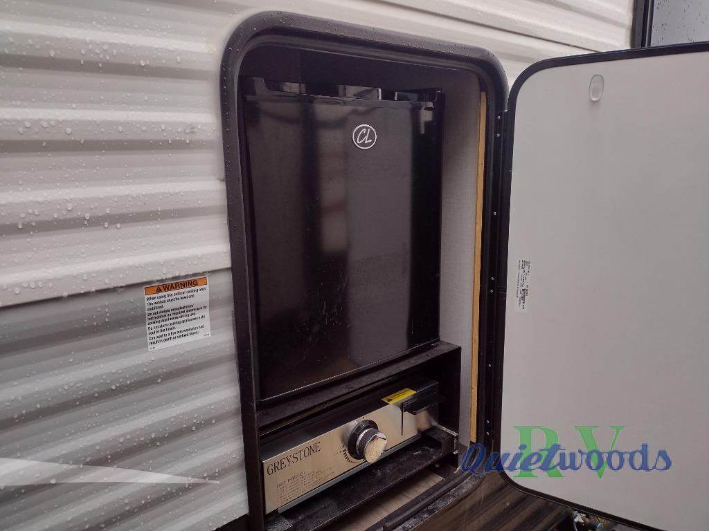The chef will love cooking at the outside kitchen of this travel trailer! The inside kitchen is fully equipped too with a two burner cooktop, a 7 cu. ft. gas/electric refrigerator, an undermount sink with sink cover, and a pantry with upper bunk storage space. There is also a vanity, a wardrobe, and a linen closet inside the rear corner bathroom for your storage needs. The kiddos can sleep on the set of 42" x 74" bunk beds and you can sleep on the front 75" x 54" Murphy bed which transforms into a U-shaped dinette with a free standing table. Watch your favorite movies at night with the entertainment center too!
