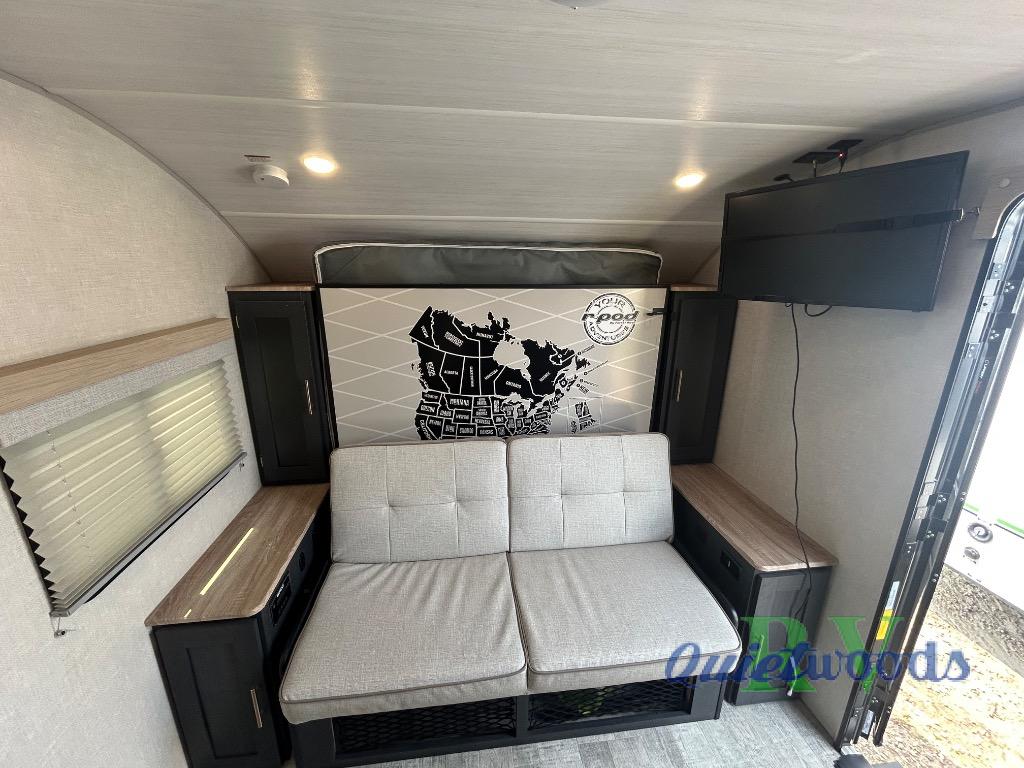 This R-Pod offers a great flexible floorplan. The living area sofa hides a 60" x 74" Murphy bed which can be folded down at night, giving you full use of the room during the day. At the rear is a pair of 44" x 74" double bunks which provide a spacious private sleeping area for children or guests. The dinette booth can also be used for an additional bed as needed. An efficient kitchen an L-shaped counter with stools will make meals easy. And everyone will appreciate the rear corner bath with shower to clean up at the end of a long day!